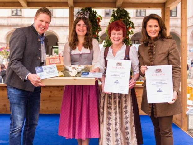 Im Rahmen des Wettbewerbs "Bayrische Käseschätze gesucht", die die Landesanstalt für Landwirtschaft durchführt, wurden wir in den Kategorien "Rotschmiere, Affinage & Co - Halbfester Schnittkäse" und "Weißschimmel - Weichkäse" augezeichnet. Zu den Gewinnern gehören unsere "Süße Sissi" und unser "Roter Casanova". Frau Kaniber persönlich überreichte uns am Sonntag, den 28.09.2025 im Rahmen des Käse-Genussmarkts unsere Auszeichnungen.