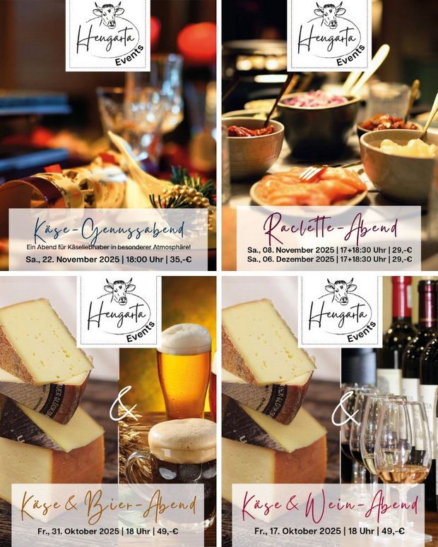 Herbstzeit ist Schlemmerzeit. Wir starten mit unseren Events! Ob ein Käse-Genussabend, Raclette mit guten Freunden oder eine Reise durch unsere Käse Spezialitäten mit ausgewählten Wein- und Biersorten, hier läuft einem das Wasser im Mund zusammen. Tickets könnt ihr persönlich im HEUgarta kaufen. Der Online-Ticketverkauf startet auch bald auf der HEUgarta Website.